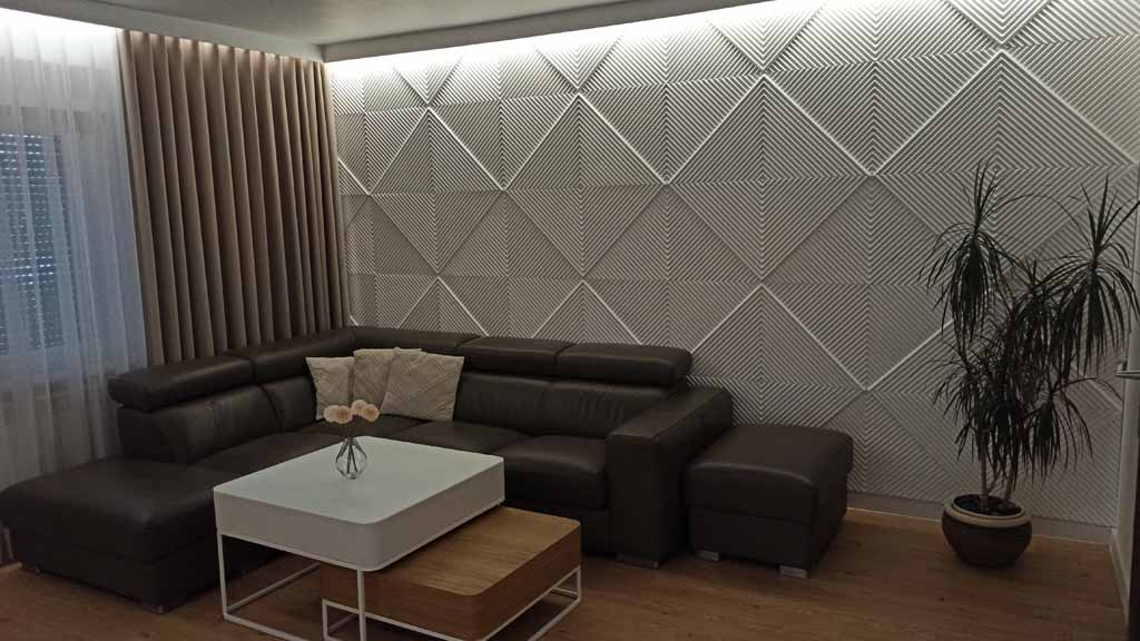 Panele mają wymiary 50,0 cm x 50,0 cm i grubości około 2,4 cm, w kilka godzin można pokryć kilkanaście metrów kwadratowych ściany, bez konieczności nawet brudzenia się (klej z tuby)! Panele można dowolnie docinać nożykiem do tapet.